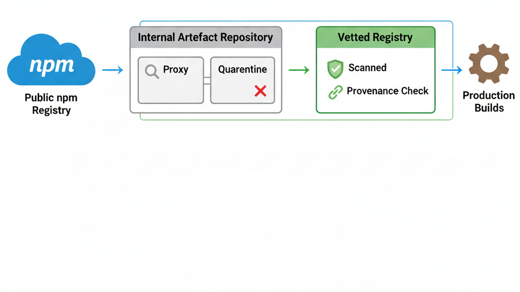 - Proxy npm through an internal artifact repository (e.g., Artifactory, Nexus, GitHub Packages).